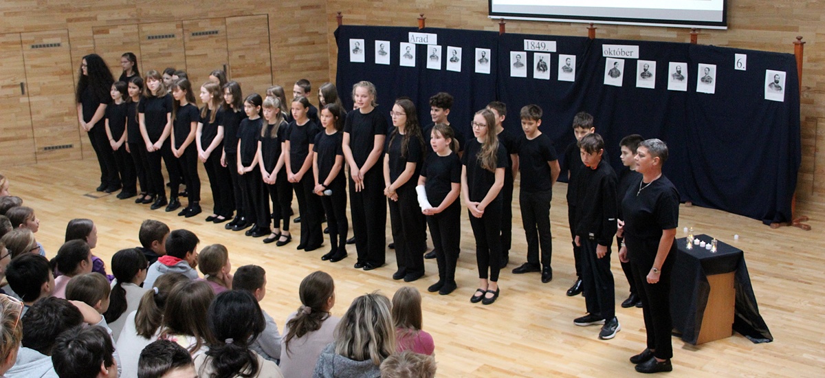 Október 6-án a Cserbán Zsanett tanárnő által felkészített 6.a osztályosok előadásában került sor az aradi vértanúk előtti főhajtásra, mely során megemlékeztek a 13 magasrangú katonatiszt és az első felelős magyar miniszterelnök személyéről és kivégzésük körülményeiről.