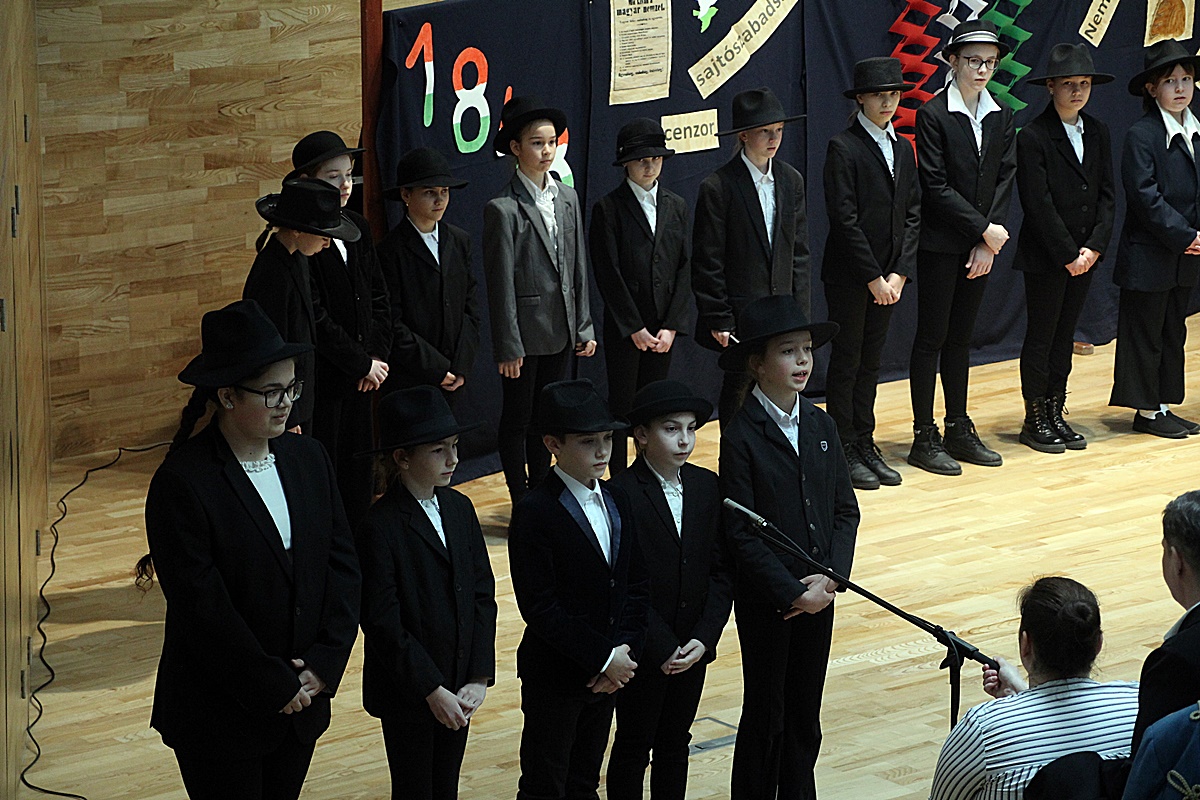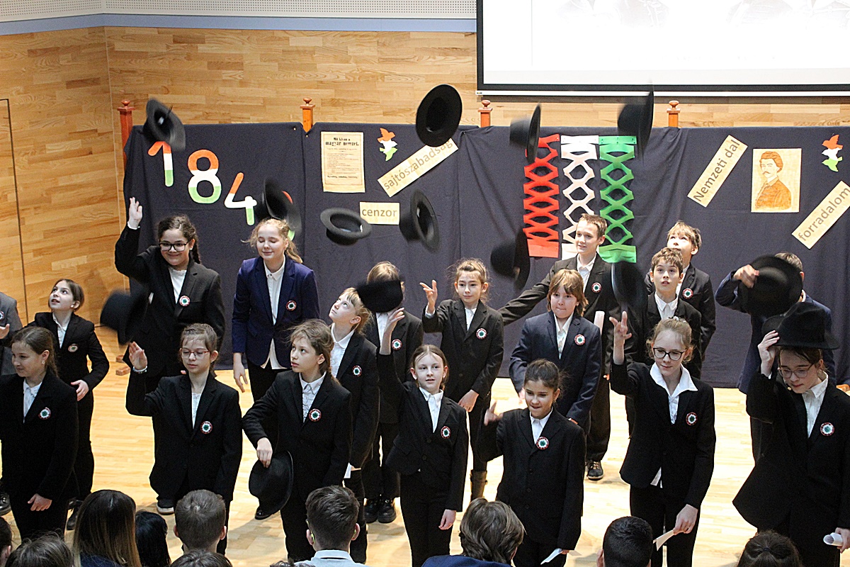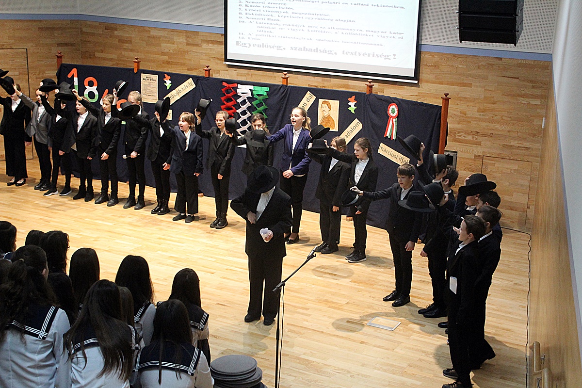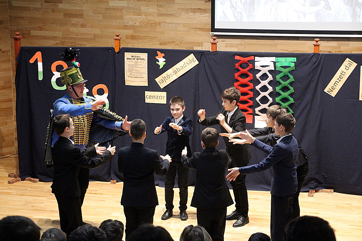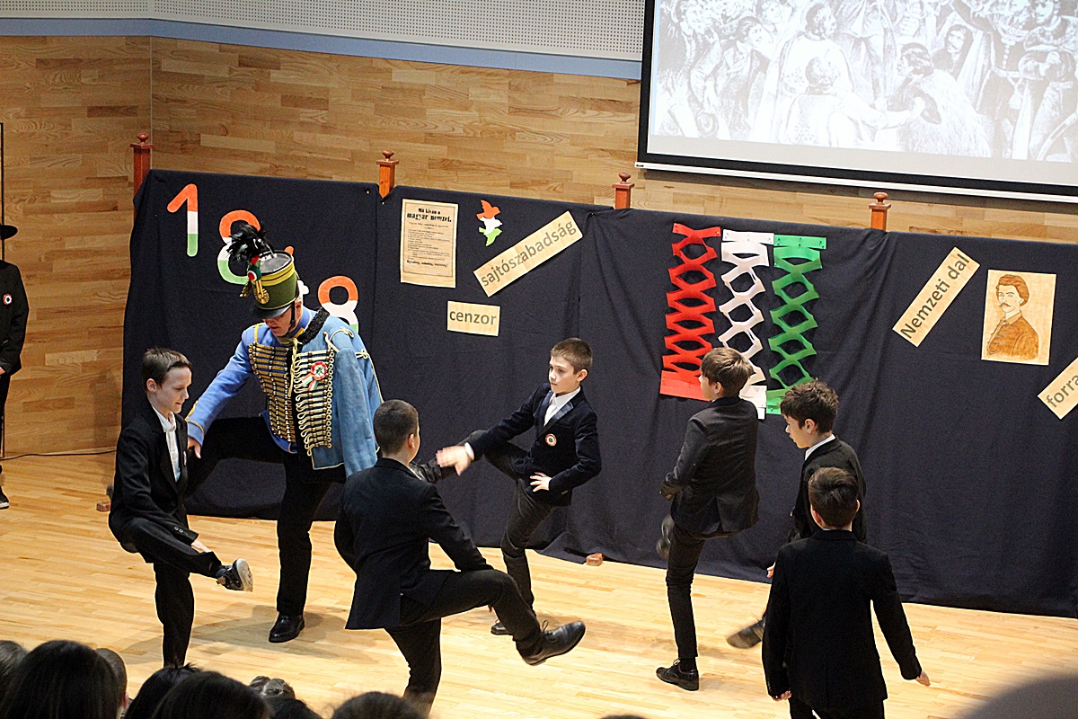 Kossuth Lajos 1847-ben elhangzott kijelentésével kezdődött megemlékezésünk március 14-én. A Cserbán Zsanett tanárnő által felkészített 5.a osztályosok előadásában elevenedtek meg azok a személyek, eszmék, események, amelyek az 1848. március 15-ei történésekhez vezettek. A „Legyen béke, szabadság és egyetértés!” jelmondata, valamint a „magyar nemzet dala” lelkesítő sorai mellett a Marton János tanár úr által betanított toborzótánc színesítette az előadást. Idén az Országos Papi Otthon ellátottjai is meghívást kaptak megemlékezésünkre, melyet szeretettel és meghatottsággal fogadtak.