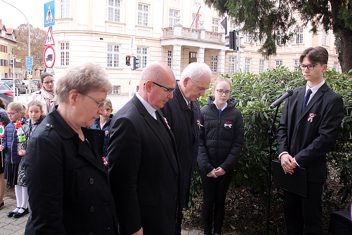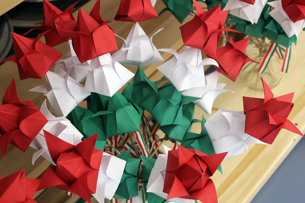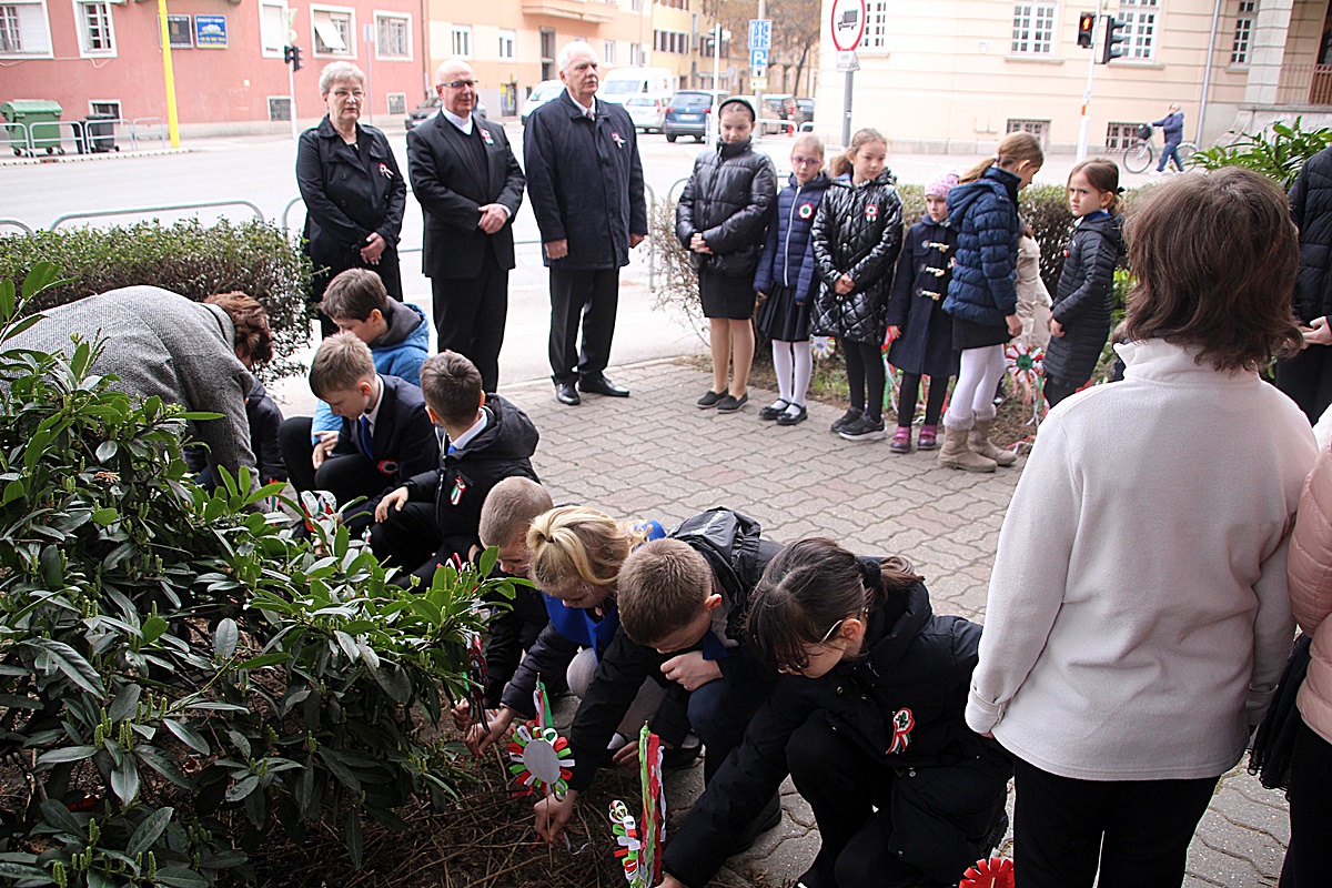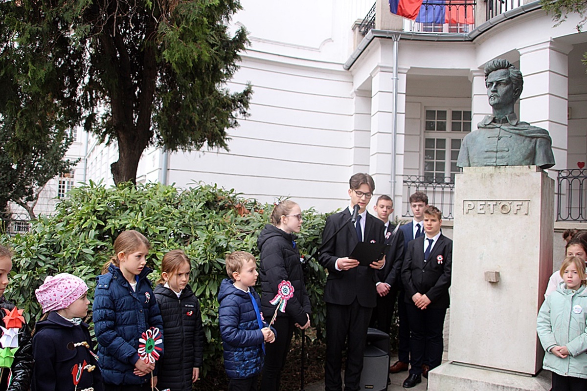 Intézményünk vezetősége koszorút helyezett el a Petőfi-szobornál, ahol Skabla Vivien 5.a osztályos tanuló elszavalta a Nemzeti dalt, az osztályok képviselői pedig az alsó tagozatos kamarakórus énekkísérete mellett elhelyezték a szobor körül az egyedileg készített kis zászlókat.