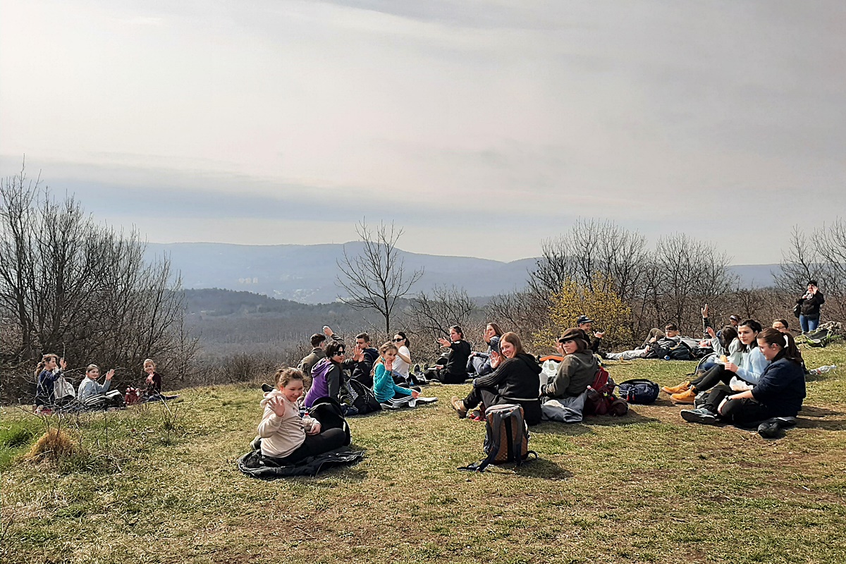 A mindig izgalmas budapesti tömegközlekedés után a Hármashatár-hegyre kapaszkodtak fel a résztvevők, ahol egy napfürdőzős piknik után elérték a Guckler Károly-kilátót, majd hamarosan a repülős játszótéren találták magukat. Itt kiderült, hogy – szerencsére – még gimnazistáinkban is ott rejtőzik az örök gyermek. A hegyről való ereszkedés is tartogatott izgalmakat a technikás terep révén, ugyanis a túrázóknak hol sziklás ösvényen, hol pedig kimosott fagyökerek között kellett leküzdeniük a jelentős szintkülönbséget. Szerencsére mindenki épségben leért, így folytathatták útjukat az újabb szépkilátási ponthoz, az Árpád-kilátóhoz, ahonnan különleges látvánnyal tárult eléjük a főváros. A túra utolsó állomása a Pál-völgyi-cseppkőbarlang volt. A vezetés során leereszkedtek tíz emeletnyi mélybe, felkapaszkodtak egy tyúklétrán, megmászták az Óriások Lépcsőjét, felfedezték a barlang ősmaradványait, mi több, igazán közelről láthattak alvó denevéreket is. A tartalmas nap végén megérdemelten vehették át a résztvevők a túra teljesítéséért járó oklevelet.