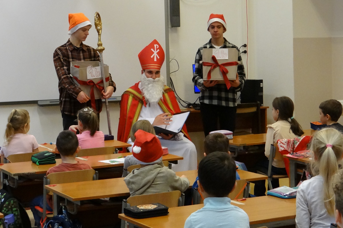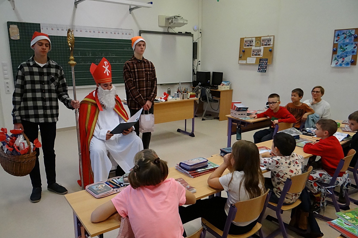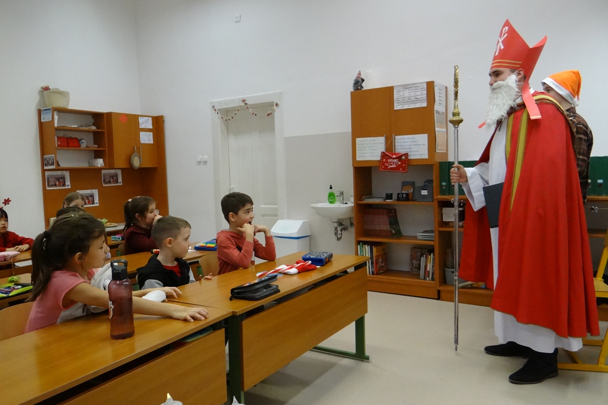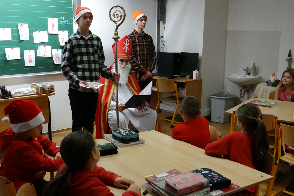 Legkisebb tanítványainkat személyesen kereste fel a Szent István téri épületrészben, ahol minden osztályközösséghez szólt néhány dicsérő, megszívlelendő szót. Természetesen a nagyobbakról sem feledkezett meg, hiszen segítői minden osztályba eljuttattak egy kis finomságot, mellyel megörvendeztették még a legidősebb tanulókat is.