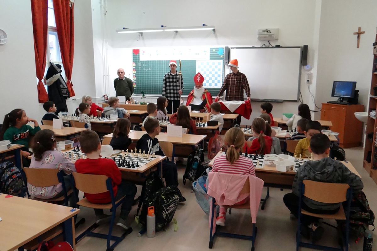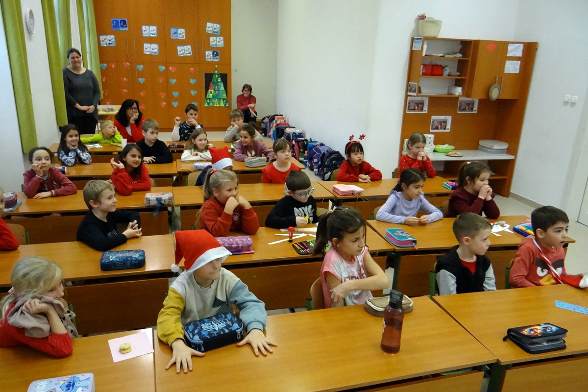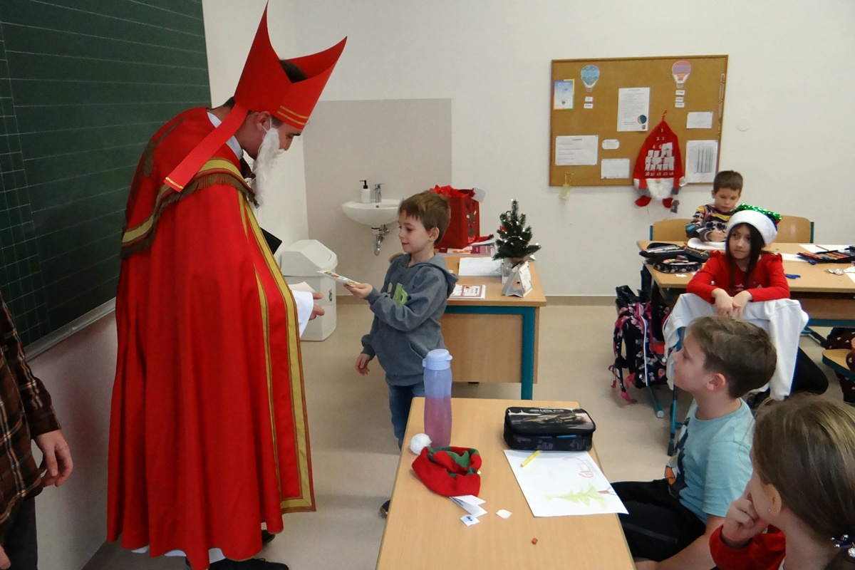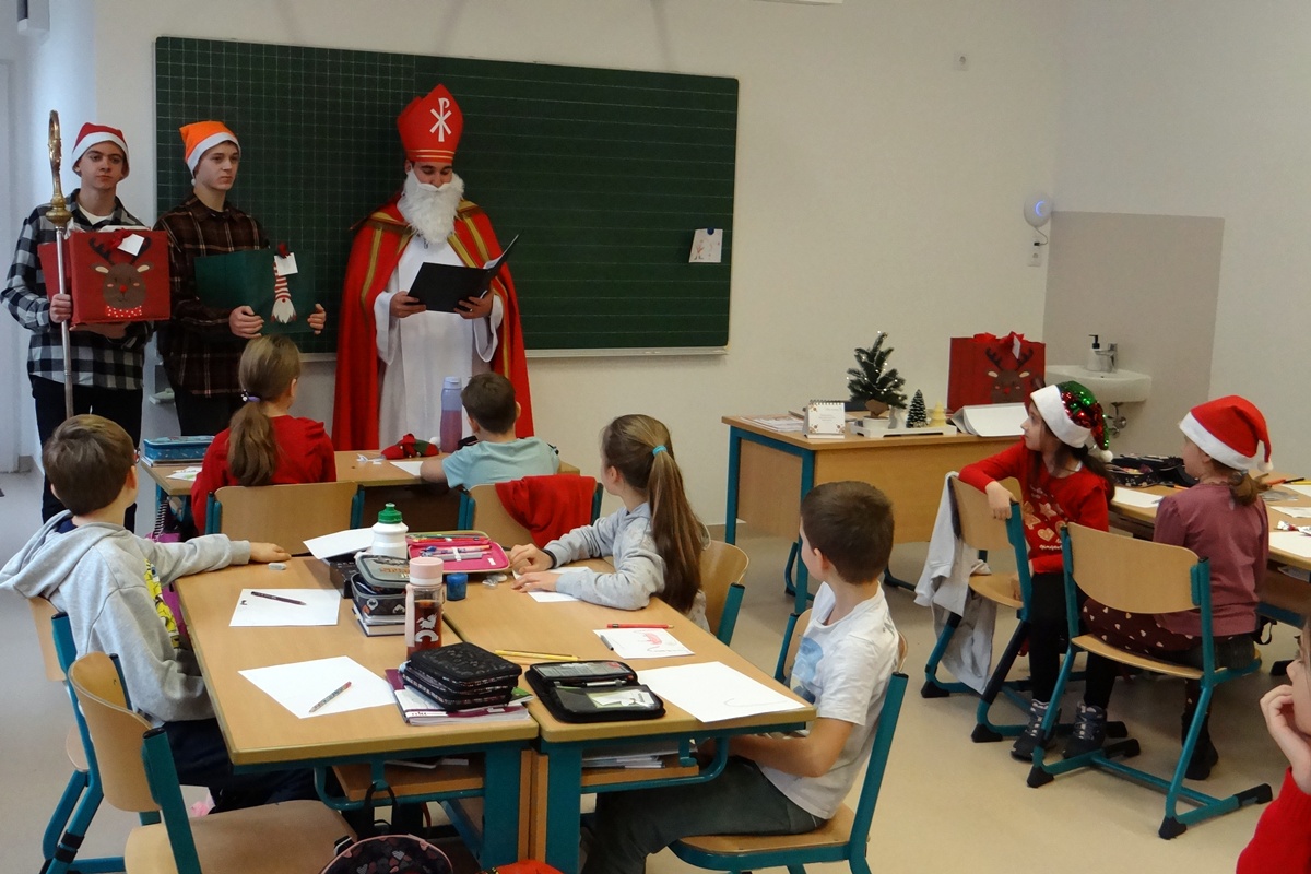 Legkisebb tanítványainkat személyesen kereste fel a Szent István téri épületrészben, ahol minden osztályközösséghez szólt néhány dicsérő, megszívlelendő szót. Természetesen a nagyobbakról sem feledkezett meg, hiszen segítői minden osztályba eljuttattak egy kis finomságot, mellyel megörvendeztették még a legidősebb tanulókat is.
