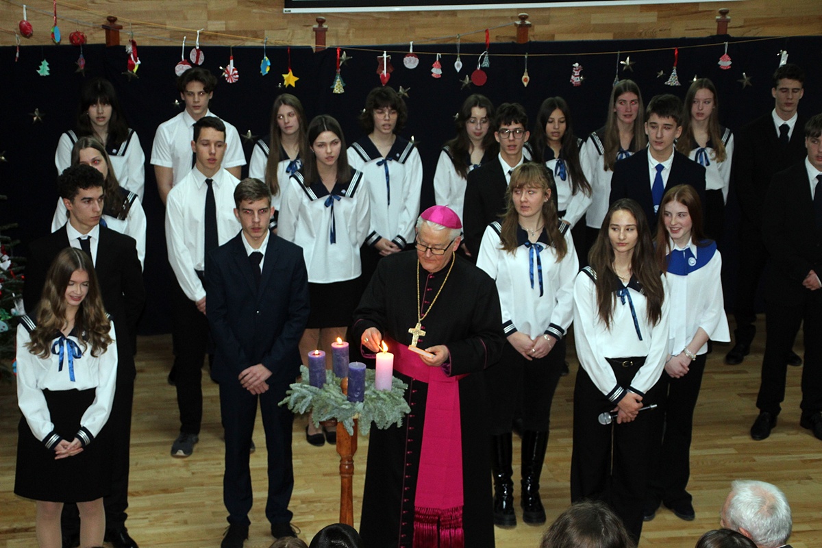 Az öröm lángja is ég. Felső tagozatosokkal kiegészült gimnazistáink meghitt műsora után Spányi Antal püspök atya gyújtotta meg a harmadik adventi gyertyát december 15-én.