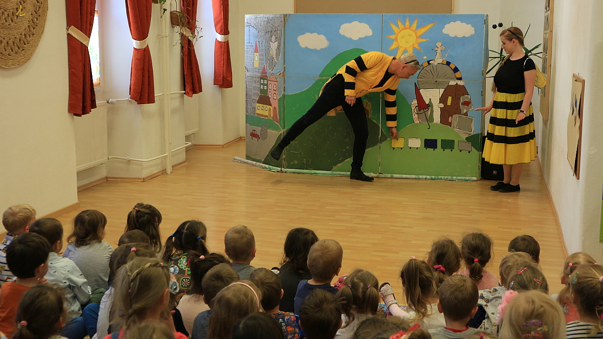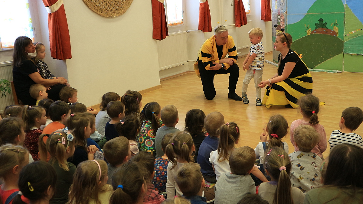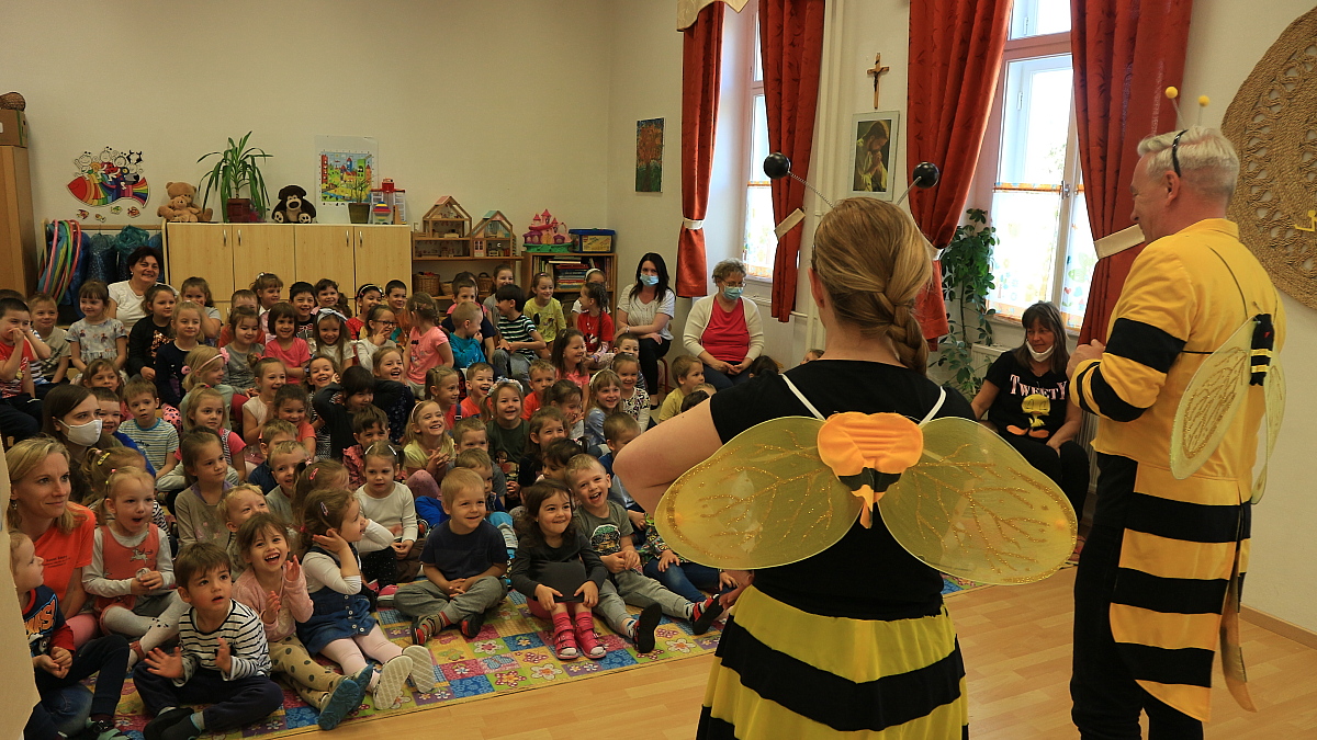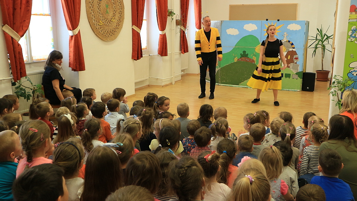„A virágzó ház” című interaktív meseelőadást tekintettük meg, melyben Zizi és Mézi, a kedves kis méhecskék történetét követtük nyomon. A két szorgos kis méh egy hatalmas, virágzó rétet keresett, hogy sok virágport tudjon gyűjteni. Sajnos azt vették észre a magasból, hogy bizony nem gyönyörű virágok pompáznak a réten, hanem szemétdomb éktelenkedik a kedvenc helyükön. Nagyon elkeseredtek, de az óvodások segítségével pillanatok alatt eltüntették az emberek által összehordott szemetet. Megtanultuk, melyik fajta hulladékot, melyik színű tárolóba kell dobni, így nemsokára már újra a tarka réten gyűjthették a nektárt a kis méhecskék. Sajnos az égből azt is észrevették, milyen koszos a tó és környéke, valamint a városban mennyire füstös a levegő, emiatt az itt lakó élőlények nagyon szomorúak. A szorgos állatok ezekre a problémákra is megoldást találtak a gyermekek közreműködésével. A mese közben sokat kacagtunk, mondókáztunk, és gyakran ugrottunk talpra a színészek kérésére, hogy tánccal, egy kis mozgással színesítsük az előadást.
