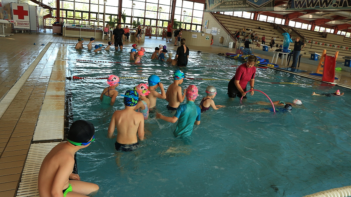 Az ovisok egyik fele egyelőre csak ismerkedett a vízzel, könnyebben elvégezhető feladatokat adott nekik Judit néni és Marci bácsi. Kezükkel-lábukkal „habot vertek”, óriásokká, majd törpévé változtak. A medence másik felében a gyermekek már siklottak, lábtempóztak, karikán úsztak át, ügyesen hajtották végre a feladatokat, amit Kriszti néni kért tőlük.