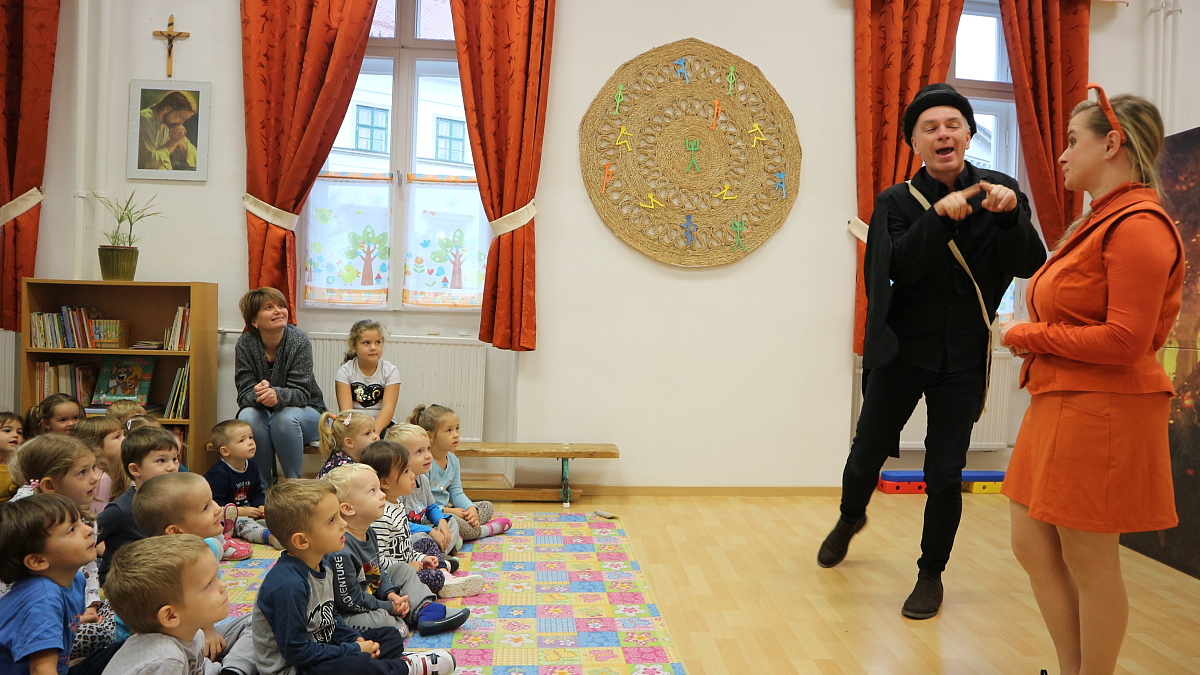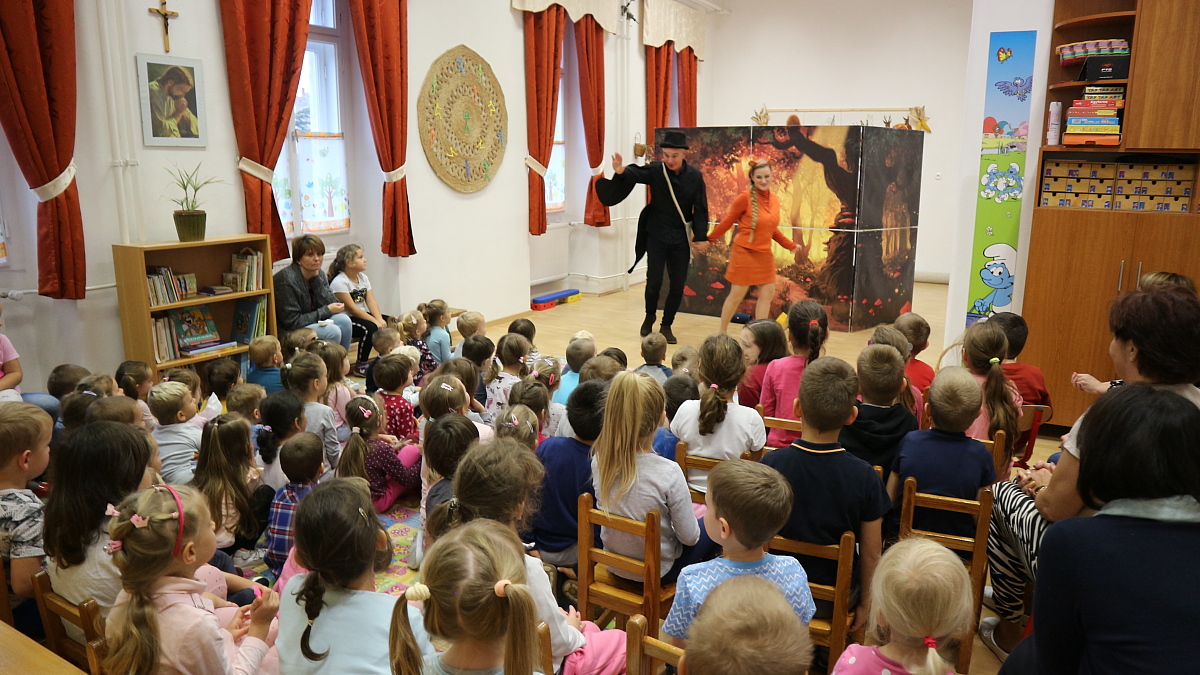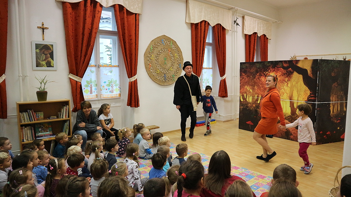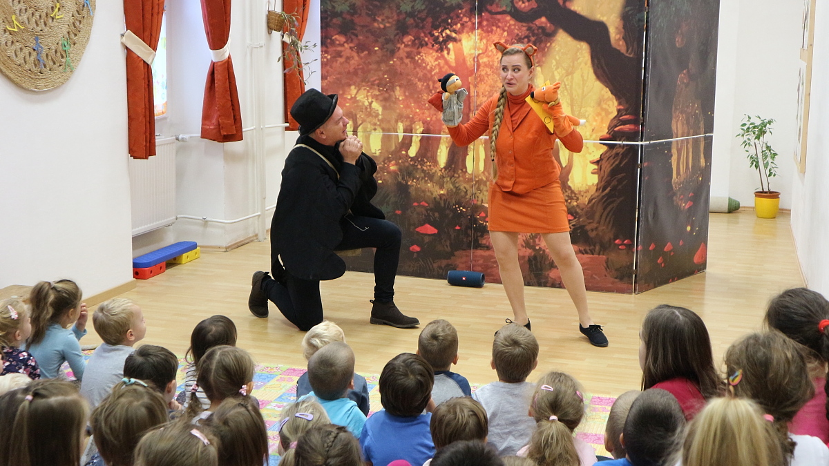 A holló és a róka című interaktív mesedarab izgalmas történetét nagy érdeklődéssel figyelték az óvodások. A történet egy ínycsiklandozó sajt körül forgott a meseerdőben, ahol a gyermekek hol megsajnálták szegény pórul járt hollót, hol biztatták a bátor viselkedésre. A csalafinta róka ravaszsággal, hízelgéssel igyekezett megszerezni a sajtot. Még az általában csendes gyermekek is hangosan kiabálva próbáltak segíteni az oktondi hollónak. A mese közben volt sok kacagás, dalolás és gyakran ugrottak talpra a gyermekek a színészek kérésére, hogy tánccal, egy kis mozgással ők is bekapcsolódjanak a mesébe. A történet végén természetesen minden jóra fordult, a két jóbarát békességben élt tovább meseországban.