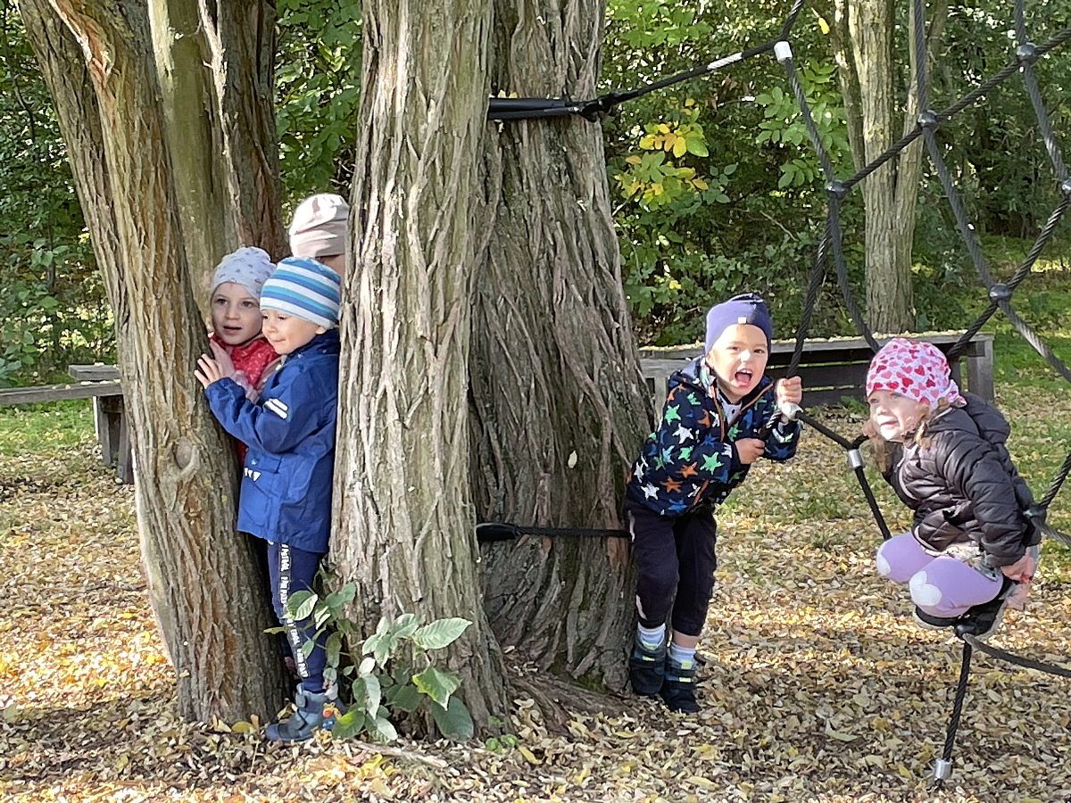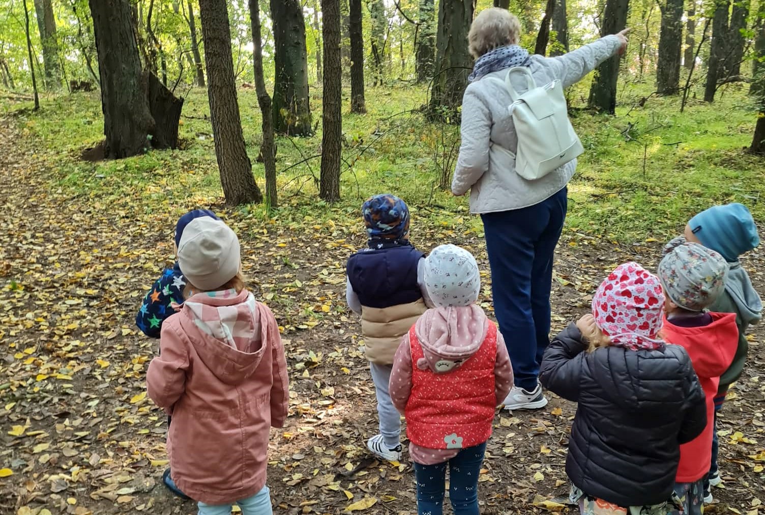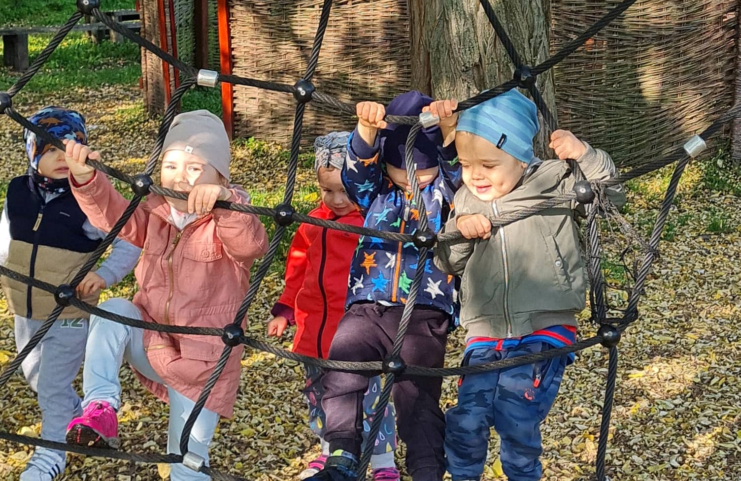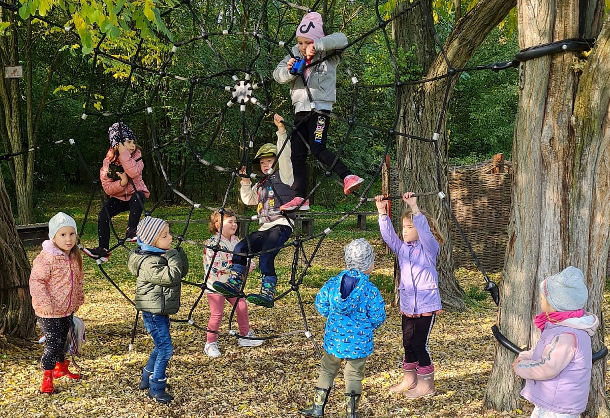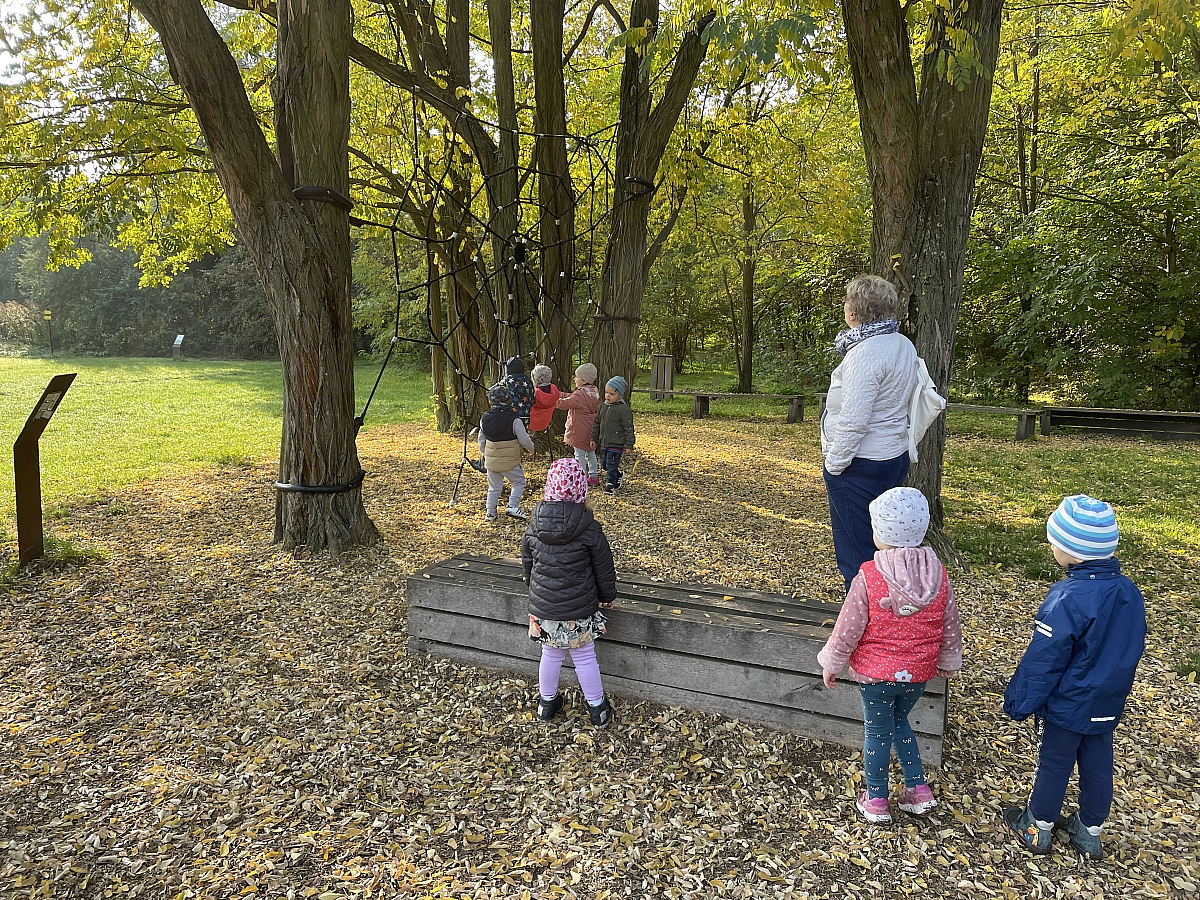 A Szivárvány csoport is a Sóstói Tanösvényt választotta kirándulása célpontjául. Az erdei úton sétáltak végig a nagy tisztásig, közben figyelték az erdő hangjait, a madarak dalolását, az őszi levelek hullásának lágy hangját, a lépteikre megzizzenő avar neszezését. A tisztáson a vejszék között kergetőztek az ovisok és a pókháló kötélmászókát is mindenki kipróbálta.
