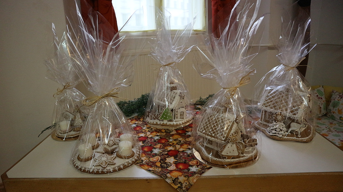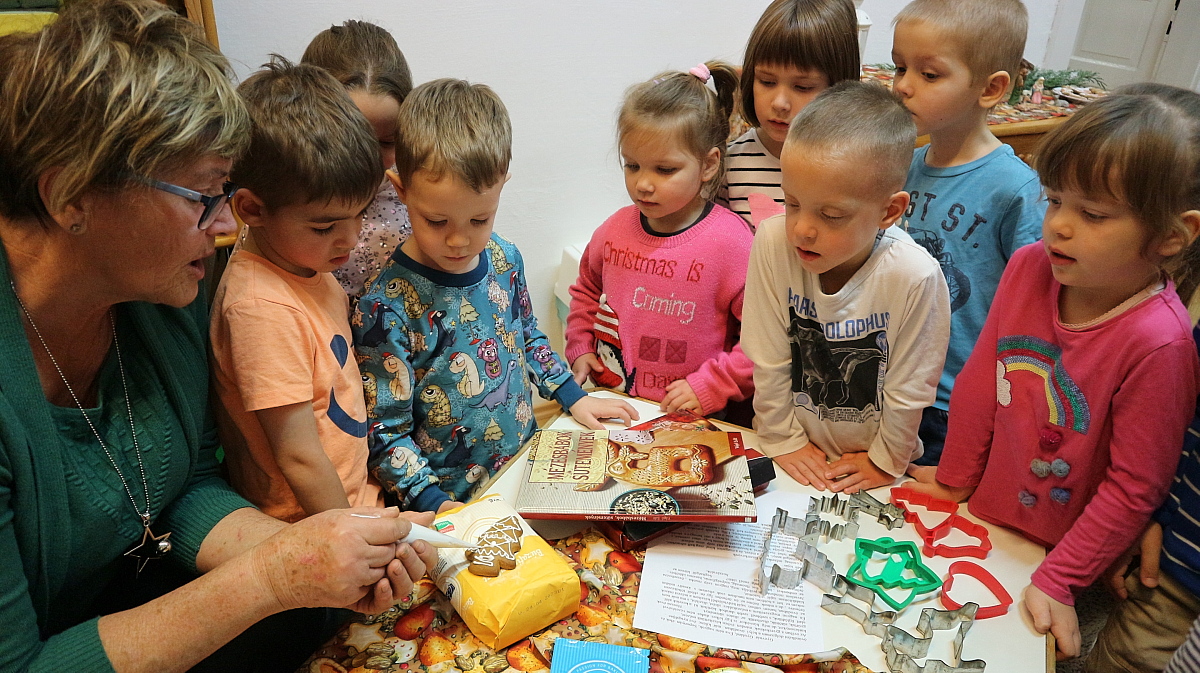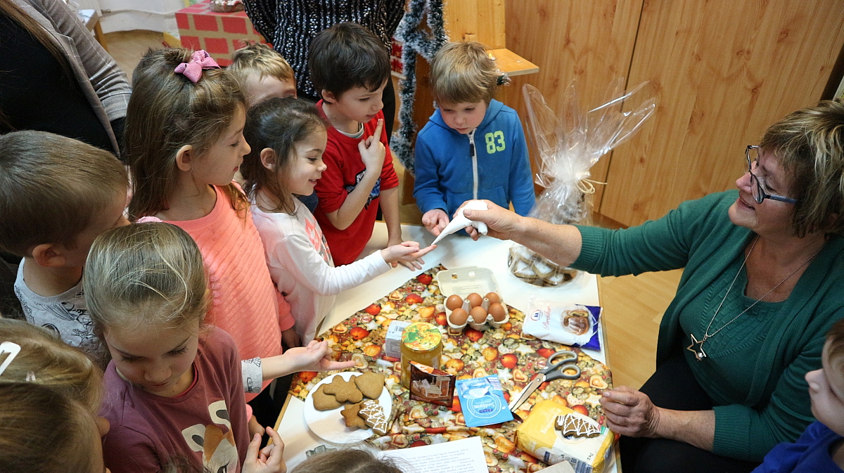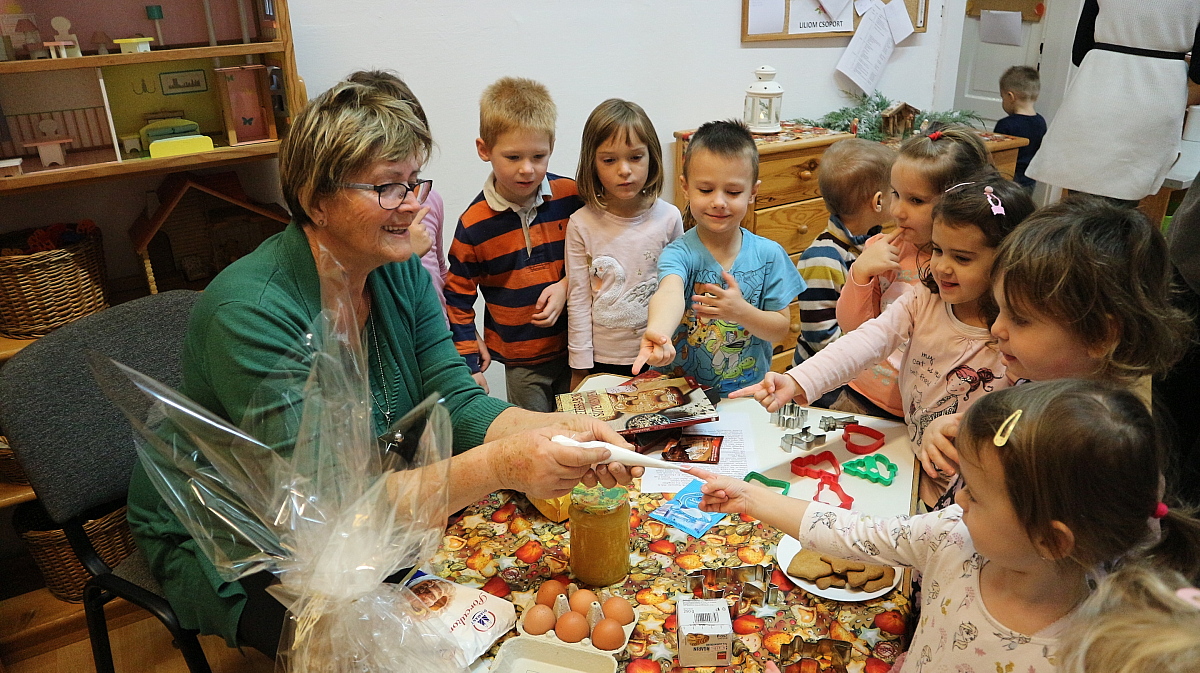 Bianka néni elmesélte a gyermekeknek a Hagyomány, ami összetart című kedves kis történetet, majd, Éva néni gyönyörű alkotásait csodálhattuk meg. Megtudtuk tőle, miként lehet finom mézeskalácsot sütni, és a motívumkészítés fortélyaival is megismerkedtünk. Az édesszájú gyermekek a díszítőmázat is megkóstolták, majd a kiállított mézeskalács-házikókat, angyalkákat, csillagokat és még számos, gyönyörűen megdíszített figurát is megtekintettek. A várakozással teli, adventi időszakra Juhász Gyula: Karácsony felé című költeményével hangolódtunk, Fruzsina néni előadásában.