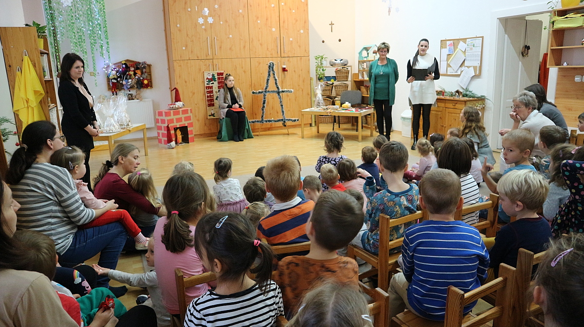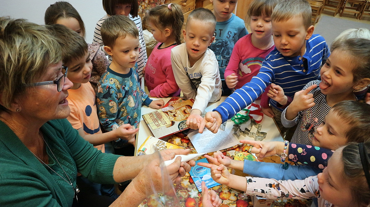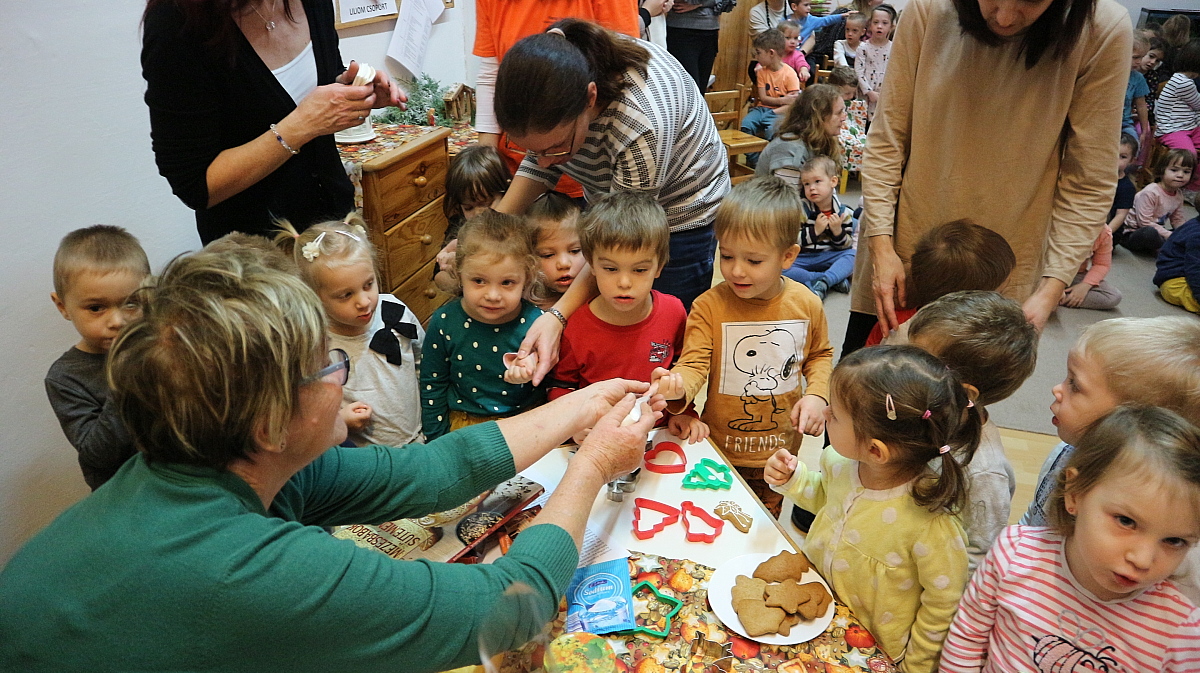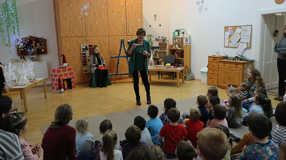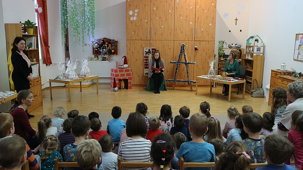 Bianka néni elmesélte a gyermekeknek a Hagyomány, ami összetart című kedves kis történetet, majd, Éva néni gyönyörű alkotásait csodálhattuk meg. Megtudtuk tőle, miként lehet finom mézeskalácsot sütni, és a motívumkészítés fortélyaival is megismerkedtünk. Az édesszájú gyermekek a díszítőmázat is megkóstolták, majd a kiállított mézeskalács-házikókat, angyalkákat, csillagokat és még számos, gyönyörűen megdíszített figurát is megtekintettek. A várakozással teli, adventi időszakra Juhász Gyula: Karácsony felé című költeményével hangolódtunk, Fruzsina néni előadásában.