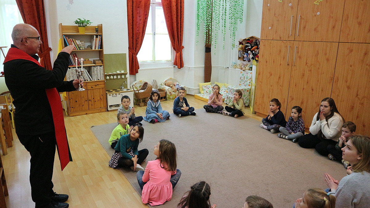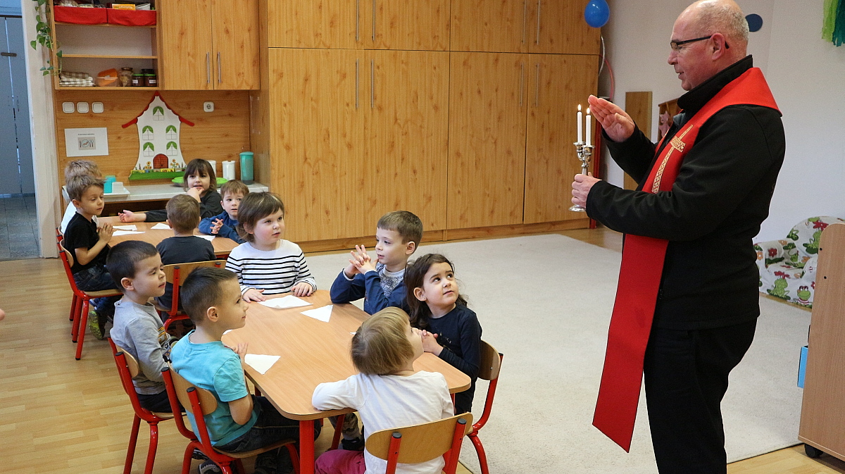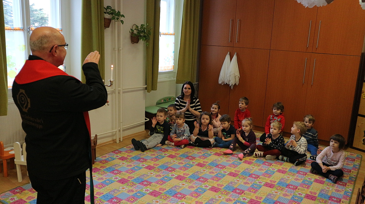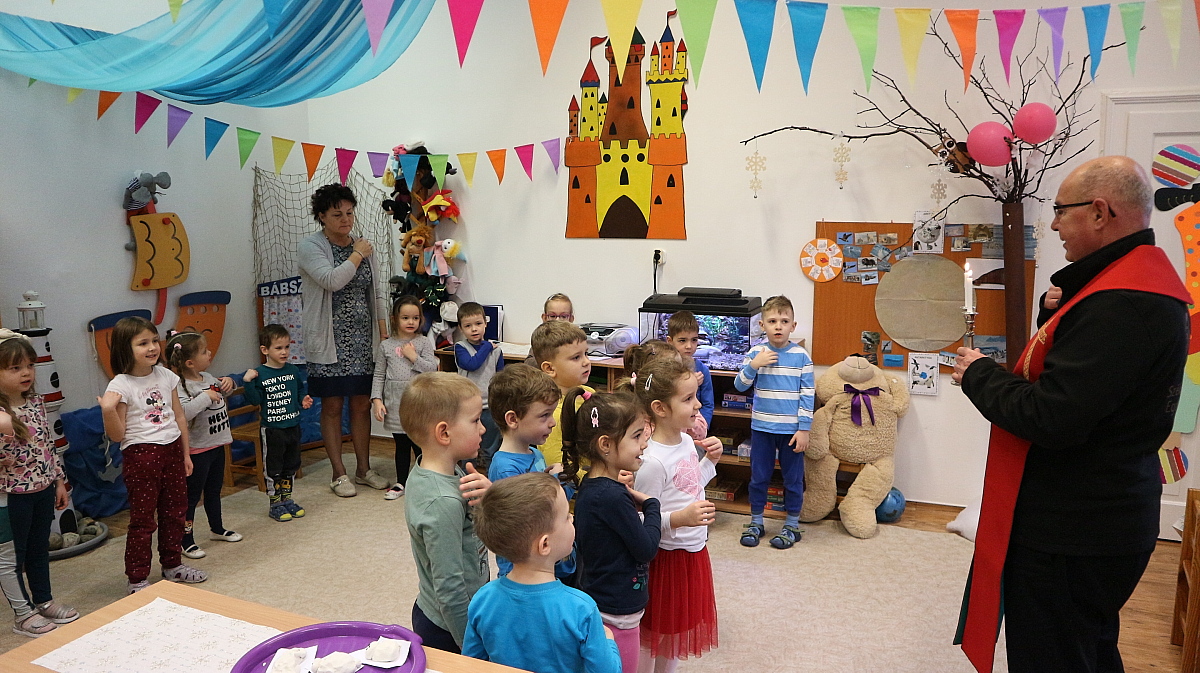 Ugrits Tamás atya is ellátogatott óvodánkba, hogy Balázs-áldásban részesítsen mindannyiunkat. Tamás atya kérte, vigyázzunk magunkra és mások testi és lelki egészségére, kerüljön el minket a torokfájás és minden más betegség. Keresztben tartott, égő gyertyával áldotta meg a jelenlévőket és családjaikat.