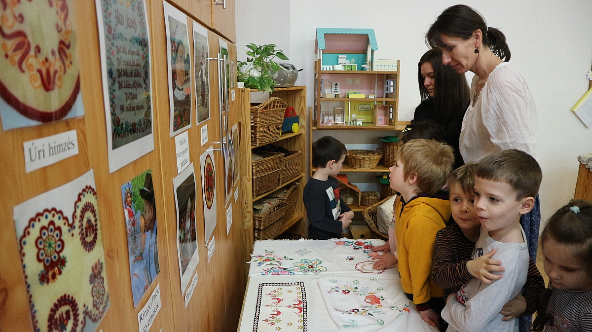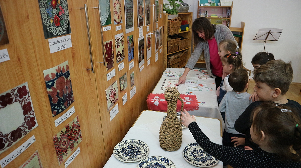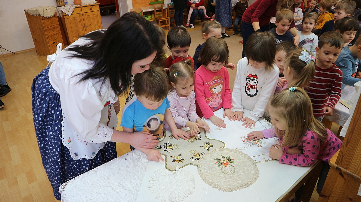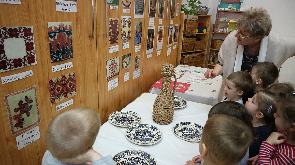 Ezúttal – rendhagyó módon – nem egy művész alkotásait figyelhették meg a gyerekek, hanem az óvodában dolgozók otthonaikból hozták el a nagymamáik, dédmamáik, idősebb rokonaik által hímzett terítőket, párnahuzatokat, kézimunkákat. A gyermekek megfigyelték, hogyan nézett ki egy régi szenesvasaló, monogramnyomó, vagy kukoricamorzsoló, megtapinthatták a sok szép, színes gombolyagot, amivel eleink hímezték a szebbnél szebb motívumokat. Nép hagyományaink megőrzésének fontosságát ily módon közvetlenül is átélték óvodásaink.