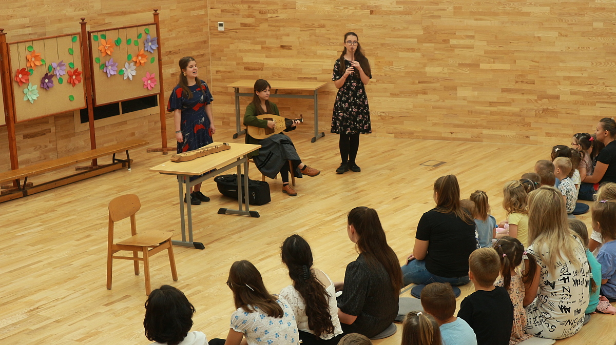 Fóris István igazgatóhelyettes úr és a zenészek először bemutatták hangszereiket, meséltek azok tulajdonságairól, majd meg is szólaltatták őket. A népi hangszerek közül a citerával már több alkalommal is találkozhattak a gyerekek, hiszen Zita néni is gyakran játszik rajta. Megismerkedtünk a tangóharmonikával, amiről többen azt gondolták billentyűi alapján, hogy egy kicsi zongora. A hangszer megszólaltatása nem egyszerű feladat, de ennek titkait is elmesélték a zenészek. A vidám, könnyed klarinét dallamait zongorakísérettel hallgattuk meg, és az oboa lágy hangjai is felcsendültek az aulában. A líraibb hangvételű gitárszóló után a növendékek közös zenéléssel és őszi dalok éneklésével zárták a koncertet.
