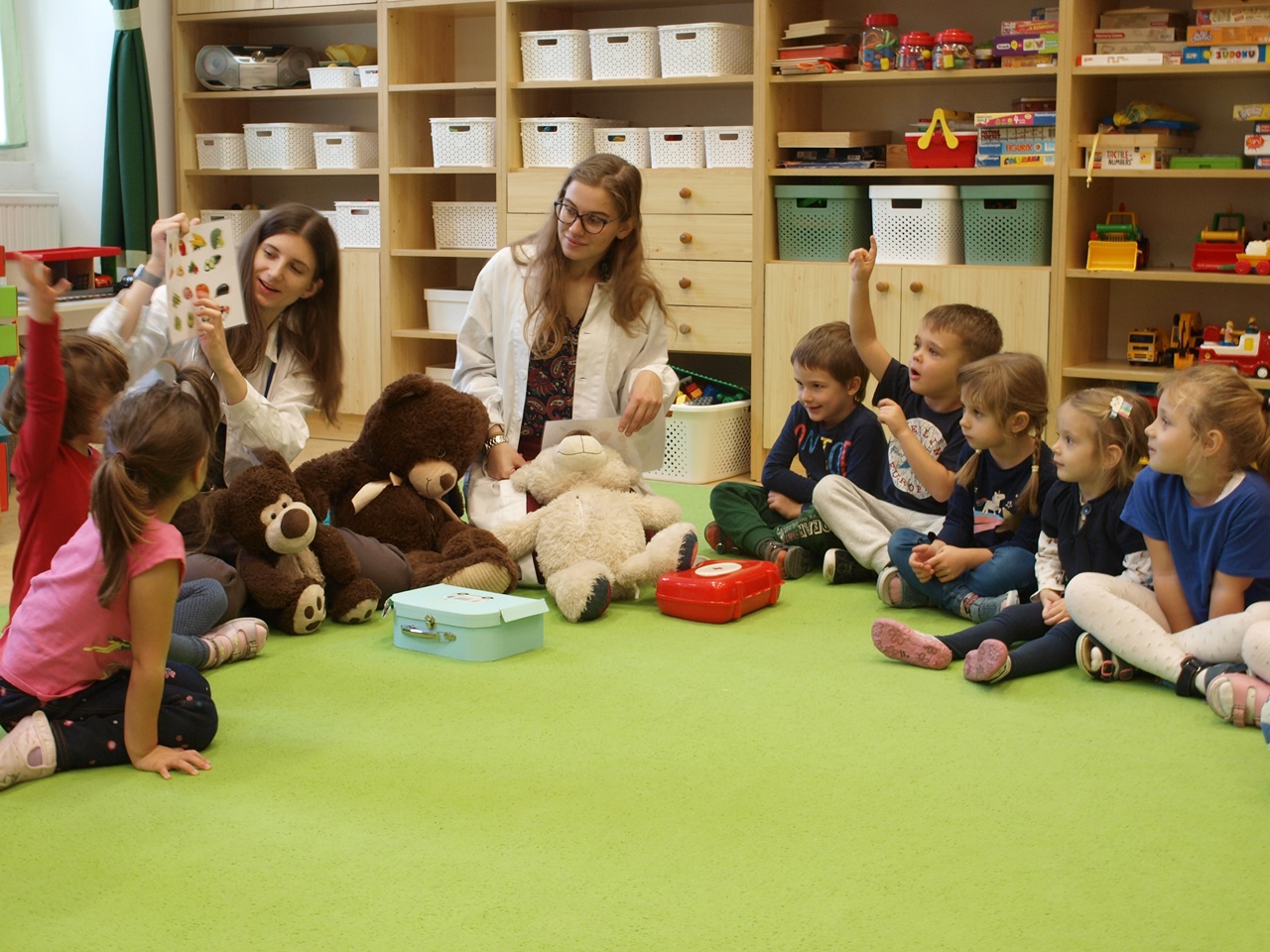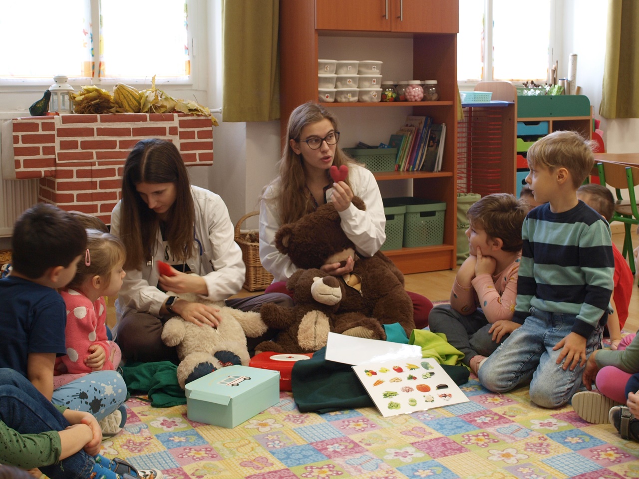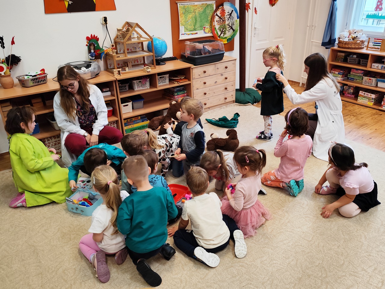 Két önkéntes orvostanhallgató Teddy macikon keresztül, játékosan mutatta be óvodásainknak az emberi test szerveit és érdekességeit. A macik hasából textilből készült szervek kerültek elő, amit a gyermekek megnézhettek és megfoghattak. Az előadás keretén belül hangsúlyozták a kézmosás fontosságát is. A foglalkozás végén a gyermekek kipróbálhatták, felpróbálhatták a játékhoz használt eszközöket, köpenyeket.