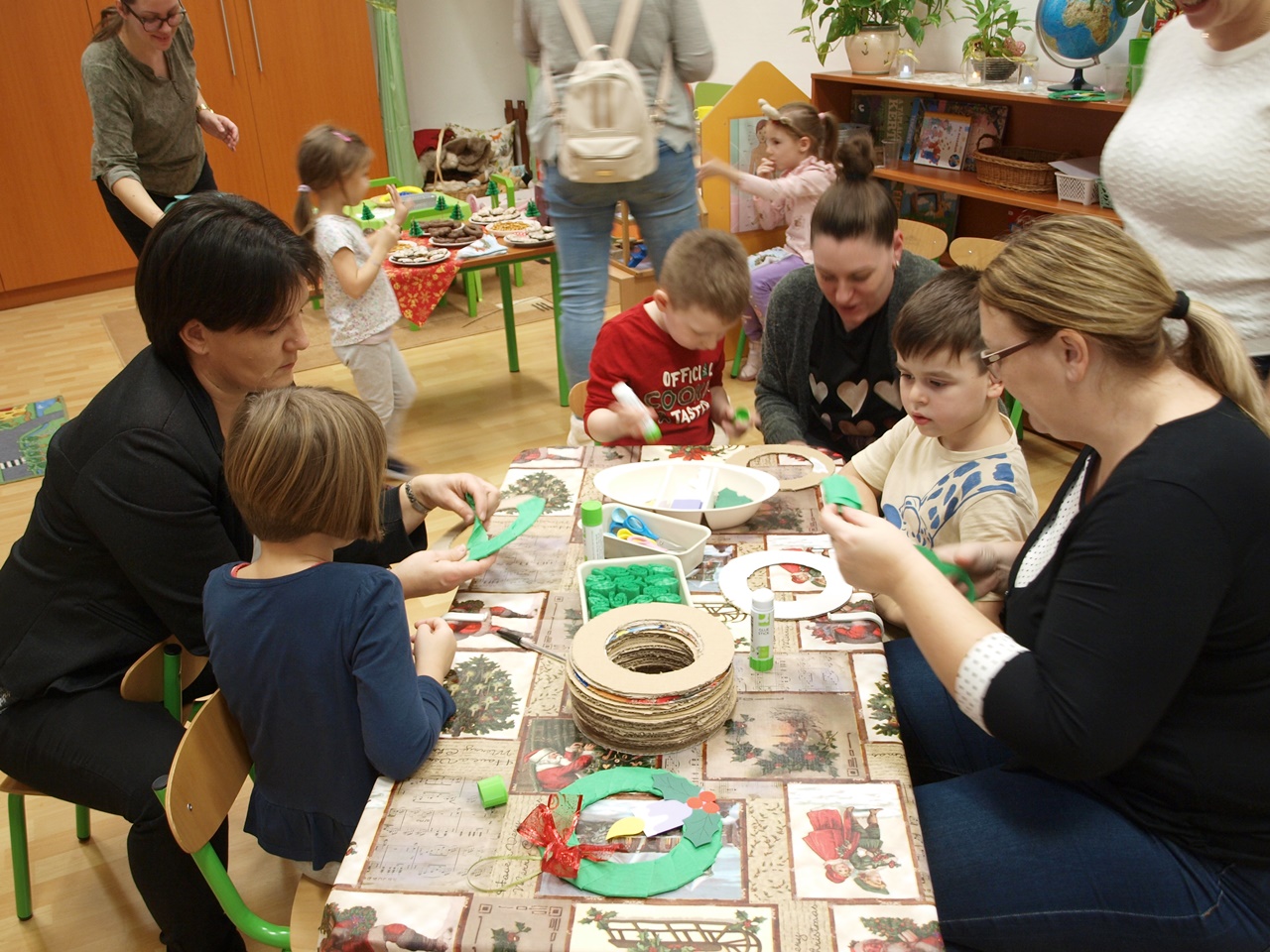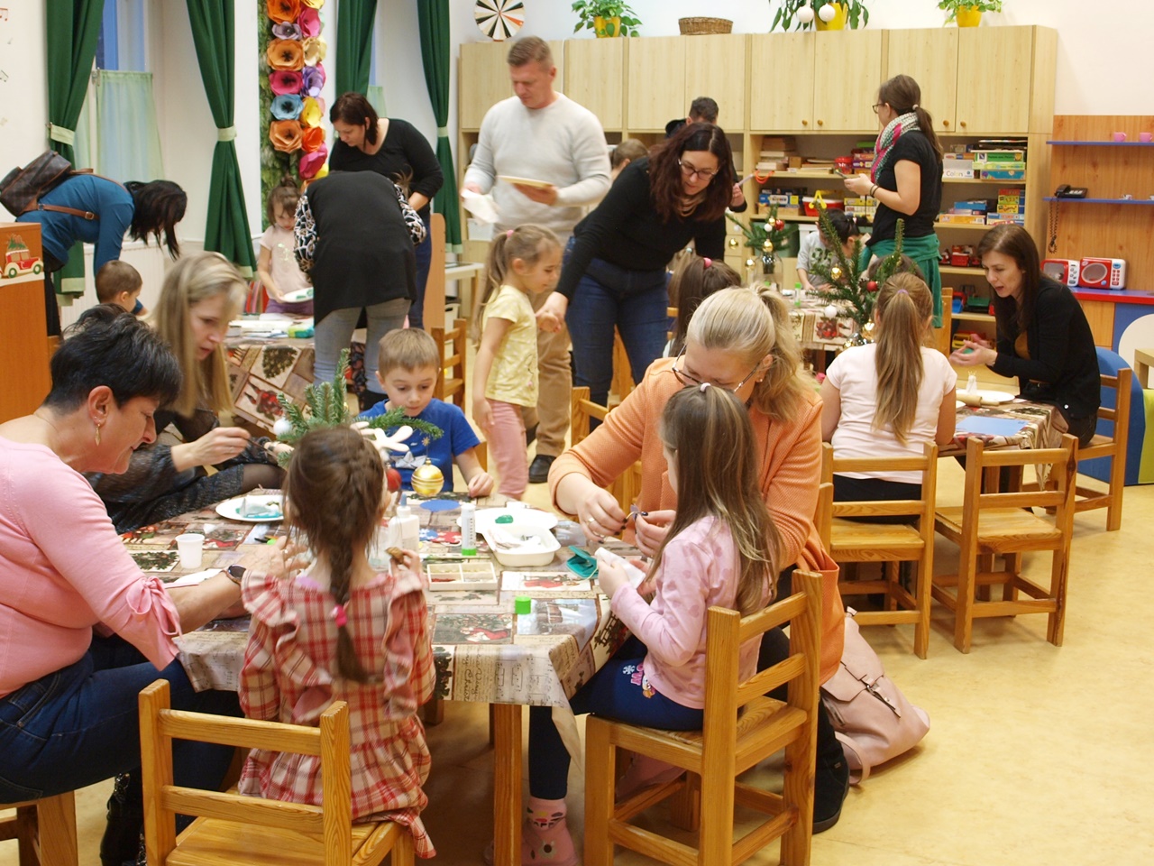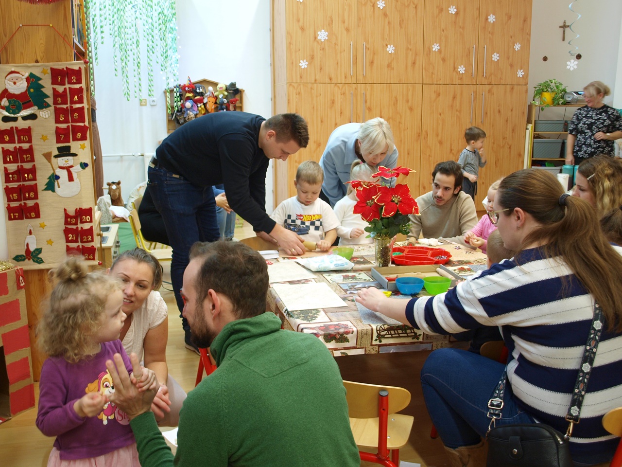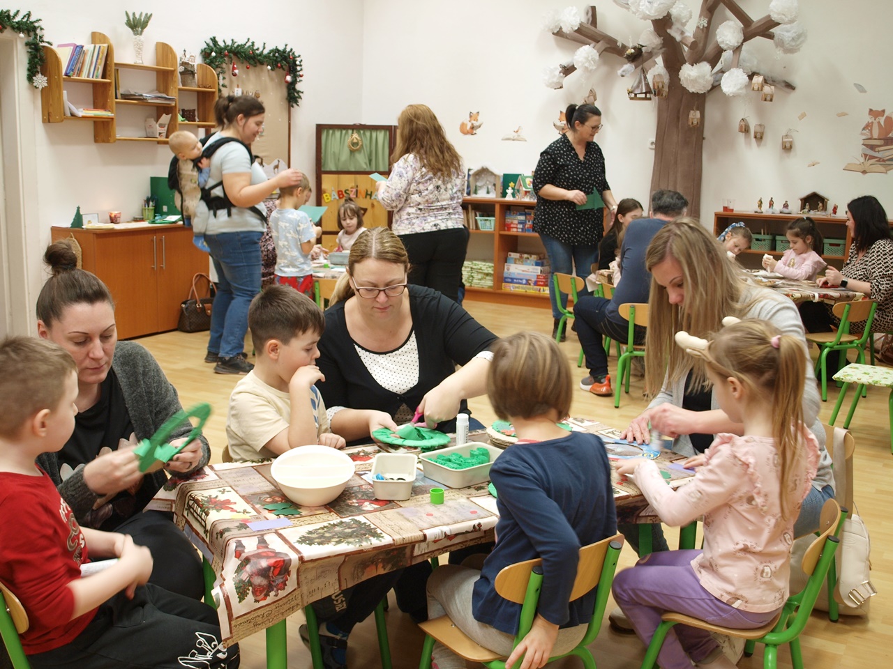 December második hetének egy-egy délutánján a gyermekek a szülőkkel közösen alkothattak a csoportokban. Készíthettek papírból karácsonyi angyalkákat, gipszből készült karácsonyfákat díszíthettek, színes gyurmából formázhattak karácsonyi díszeket, vagy éppen mézeskalácsot rajzolhattak meg. A meghitt és családias kézműves délután végeztével a gyermekek szebbnél szebb alkotásokat vihettek haza.