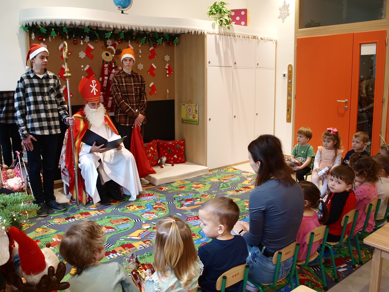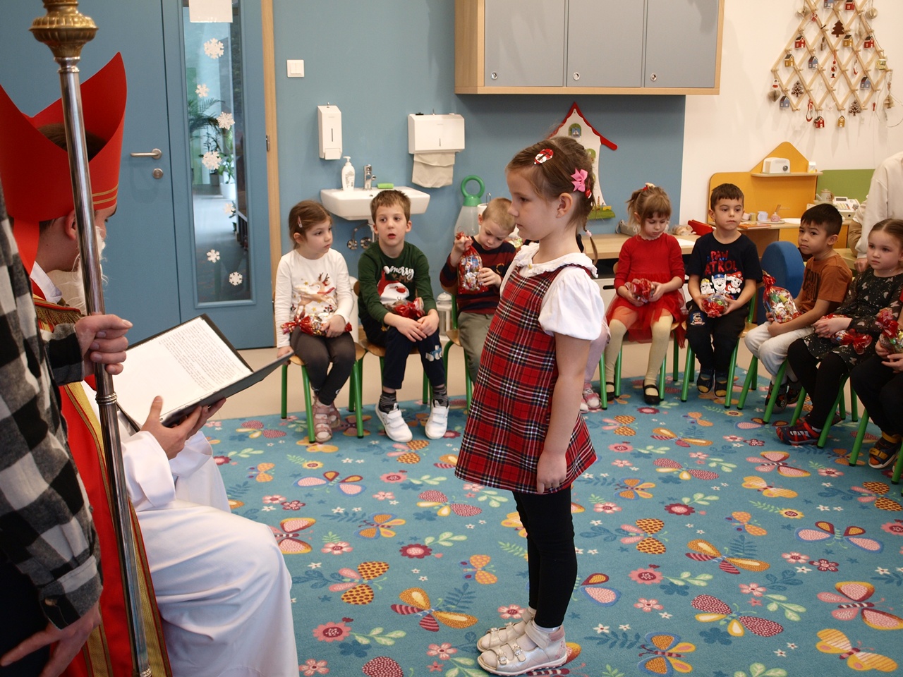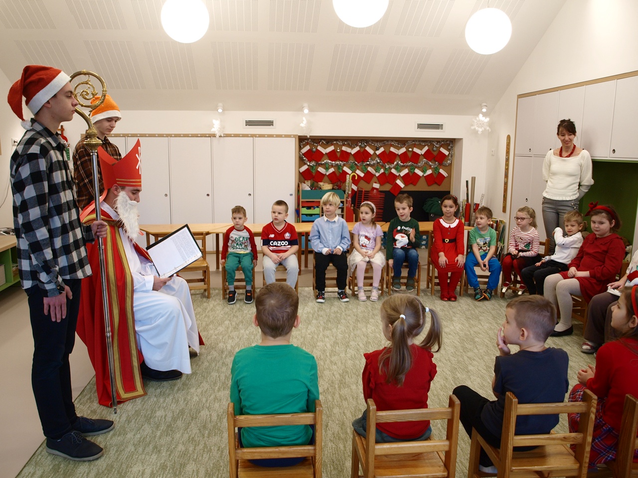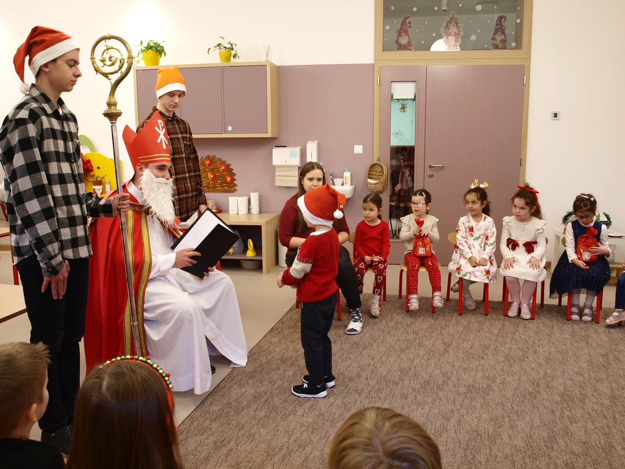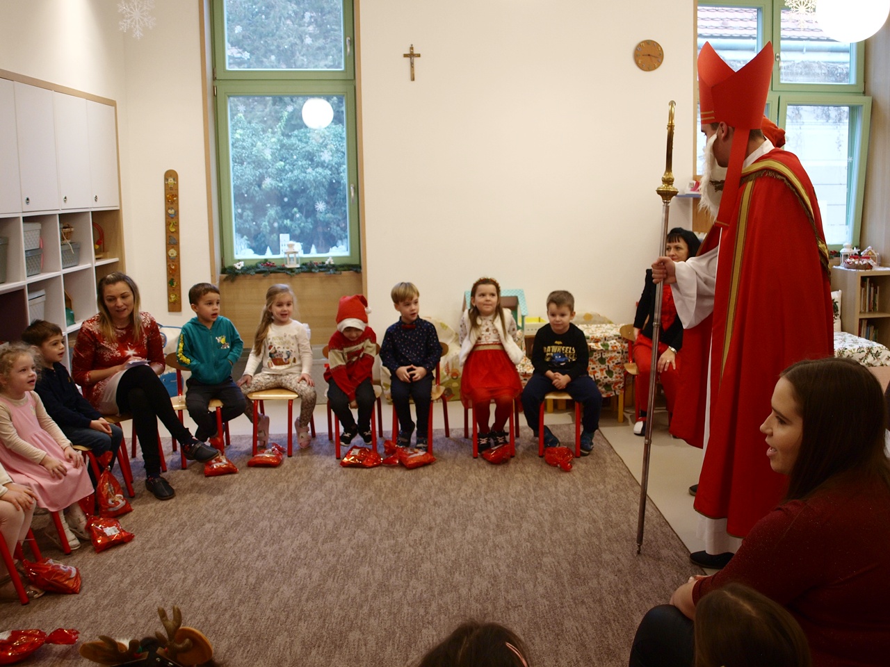 A gyerekek izgatottan várták érkezését, már messziről lehetett hallani a csengettyű hangját, amely jelezte, hogy hamarosan eljön a nagyszakállú vendég. A Mikulás kedves szavakkal köszöntötte a gyerekeket, meghallgatva rövid verseiket, énekeiket. Mindenkit megdicsért ügyességéért és jó viselkedéséért. A gyermekek bátran, mosolyogva léptek hozzá, és örömmel vették át a csomagokat. A délelőtt vidám hangulatban telt, igazi ünnepi varázslattal. A Mikulás búcsúzóul megígérte, hogy jövőre is visszatér óvodánkba, ha a gyermekek továbbra is ilyen ügyesek és kedvesek lesznek.